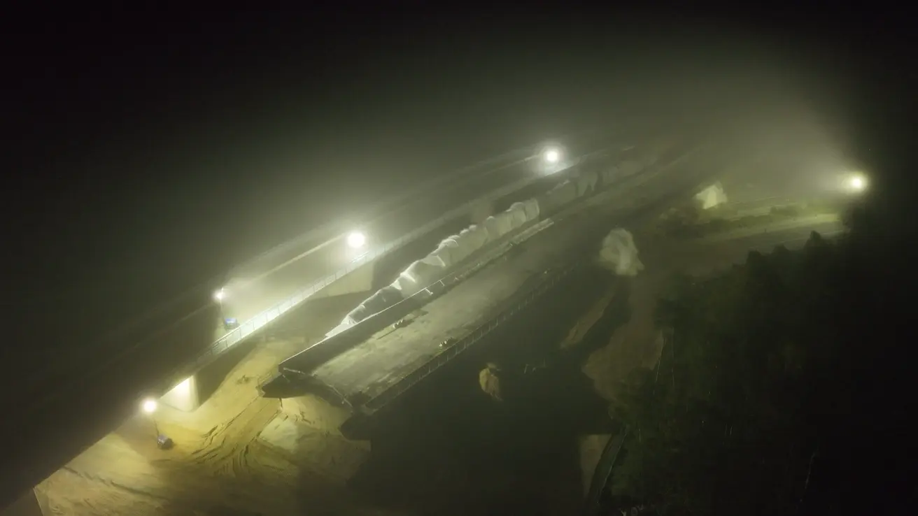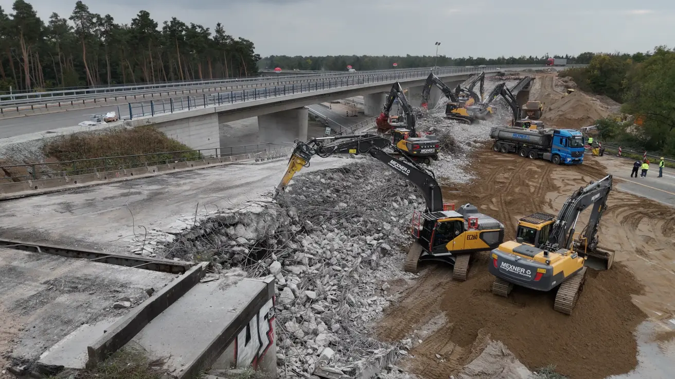 Samstag, 11. Oktober, kurz nach 4 Uhr früh: Es ging ganz schnell und hat nur wenige Sekunden gedauert. Zweimal hat es „RUMMMS“ gemacht! Dann waren die zwei alten Brückenbauwerke über der A67 am Rüsselsheimer Dreieck zu Fall gebracht. Ca. 9.000 Tonnen Gewicht – weg auf einen Schlag. Zuerst war die Rampe in Richtung Mainz dran, nach ein paar Minuten fiel die Rampe in Fahrtrichtung Frankfurt ins „Fallbett“. Wegen starkem Nebel gab es eine kleine Verzögerung.