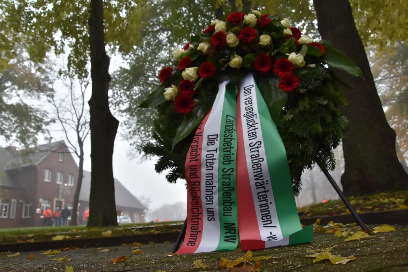 Zu Ehren der Verstorbenen legen Dr. Michael Güntner (Geschäftsführer der Autobahn GmbH) sowie Elfriede Sauerwein-Braksiek (Direktorin Niederlassung Westfalen) und Thomas Ganz (Direktor Niederlassung Rheinland) einen Kranz am Denkmal nahe der A31 in Gescher ab.
