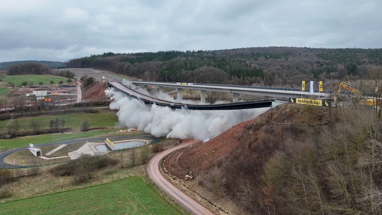 EICHENZELL. Die beiden Bestandsbauwerke der A7-Talbrücke Thalaubach sind am Sonntag, dem 15. März erfolgreich gesprengt worden. Damit ist der Weg frei für das zweite neue Teilbauwerk in Fahrtrichtung Würzburg.