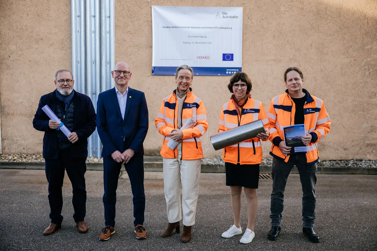 Bild: Zur feierlichen Grundsteinlegung der Verkehrszentrale Südwest wurde ein Zeitkapsel mit aktuellen Informationen zum Tagesgeschehen und zur Autobahn GmbH des Bundes befüllt. Die Personen v.l.n.r.: Peter Vorbeck (ORANGE BLU building solutions), Berthold Frieß (Ministerialdirektor im Verkehrsministerium des Landes Baden-Württemberg), Dr. Jeanette von Ratibor (Geschäftsführerin Finanzen & IT der Autobahn GmbH des Bundes), Christine Baur-Fewson (Direktorin der Autobahn GmbH Niederlassung Südwest), André Frank (Geschäftsbereichsleiter Betrieb der Autobahn GmbH Niederlassung Südwest).