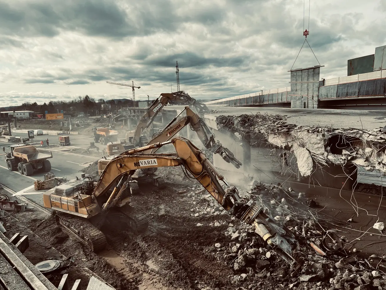 Im Zuge des Abbruchs der Hochbrücke Bayreuth war es erforderlich, die A9 zwischen den Anschlussstellen Bindlacher Berg und Bayreuth-Süd an zwei aufeinanderfolgenden Wochenenden für den öffentlichen Verkehr zu sperren. Nachdem vergangenes Wochenende bereits die Vollsperrung genutzt wurde, um zeitgleich die neue Brücke an der Anschlussstelle Bindlacher Berg einzufahren, wurde dieses Wochenende nun neben dem Abbruch der Hochbrücke Bayreuth auch eine gemeinsame Brandschutzübung mit etwa 220 Beteiligten aus Feuerwehr, THW, Polizei und Rettungsdienst in der angrenzenden Einhausung Bayreuth durchgeführt. Am Bindlacher Berg wurden im Zuge der Vollsperrung außerdem die Halbfertigteilplatten auf der neuen Brücke verlegt.