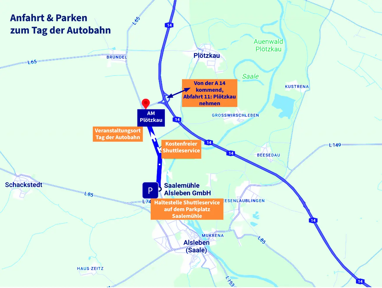 Aufgrund von begrenzten Parkplatzkapazitäten auf dem Gelände der Autobahnmeisterei sind zahlreiche Besucherparkplätze auf dem Gelände der nahegelegenen Saalemühle Alsleben GmbH (Bernburger Str. 35b, 06425 Alsleben (Saale)) eingerichtet. Die Entfernung zwischen den eingerichteten Besucherparkflächen und Autobahnmeisterei beträgt ca. zwei Kilometer. Daher wurde ein kostenfreier und regelmäßiger Shuttleservice für unsere Besucherinnen und Besucher eingerichtet.