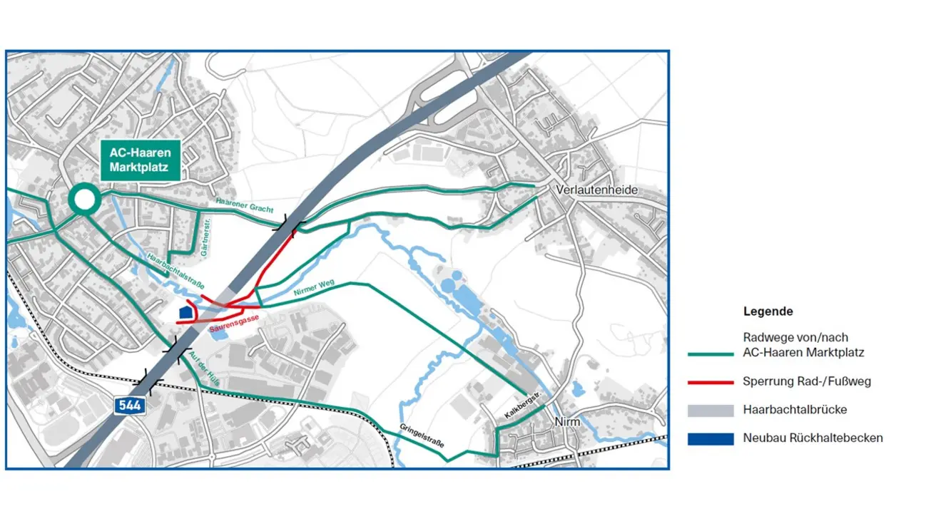 Für den Rückbau der Bestandsbrücke und den Neubau der Haarbachtalbrücke wurde die A544 zwischen dem Autobahnkreuz Aachen und der Anschlussstelle Aachen-Europaplatz seit Baubeginn im Januar 2024 in beiden Fahrtrichtungen voll gesperrt. Grund dafür waren die Ergebnisse aus den laufenden Bauwerksprüfungen der Haarbachtalbrücke.