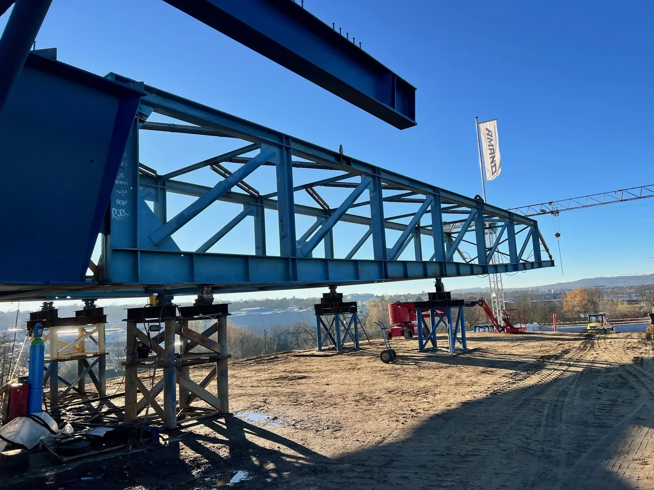 Brückenhohlkästen für die neue Haarbachtalbrücke liegen auf der Baustelle bereit, die Schweißarbeiten liegen voll im Zeitplan.
