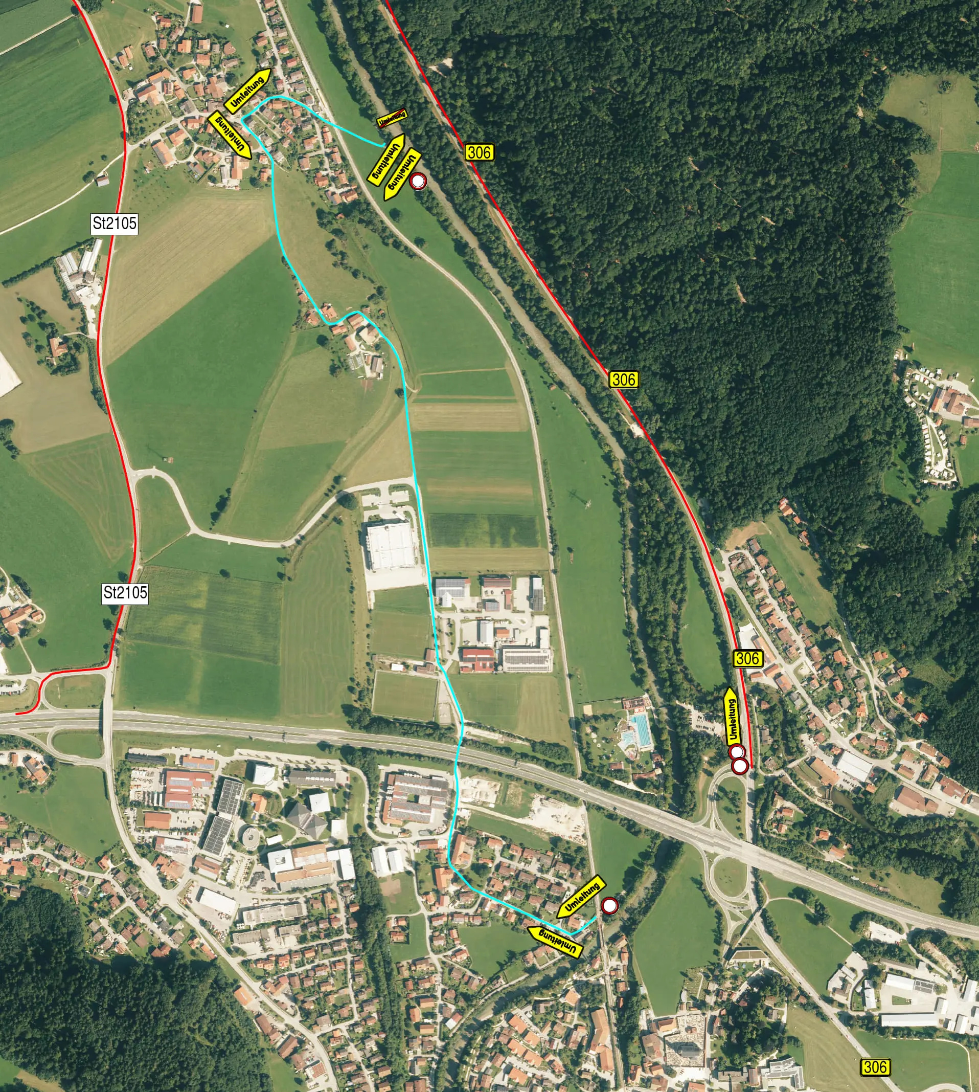 Die Umfahrungsroute läuft in Richtung Norden bis Seiboldsdorf über die B 306 und anschließend über die St 2105 zur Anschlussstelle Siegsdorf-West. Entlang der Umfahrungsstrecke werden Schilder mit Hinweisen zur Unterlassung einer Nutzung der Ortsdurchfahrt Siegsdorf als Ausweichroute aufgestellt.