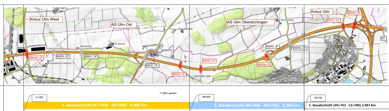 Die sechsstreifige Erweiterung der A8 von der AS Ulm-West bis östlich des AK Ulm/Elchingen erfolgt in drei Bauabschnitten und wird von den Niederlassungen Südbayern und Südwest durchgeführt. Die Niederlassung Südbayern verantwortet den Bauabschnitt 1 von Oberelchingen bis Riedheim. Zusätzlich wird die Fahrbahndecke der kreuzenden Autobahn A7 von der Landesgrenze Baden-Württemberg bis zur Donaubrücke einschließlich der Auf- und Abfahrten im Autobahnkreuz erneuert. Im Bereich des Autobahnkreuzes Ulm/Elchingen werden die bestehenden Brückenbauwerke ersetzt bzw. für die zukünftigen Verkehrsbelastungen ertüchtigt. Die Niederlassung Südwest verantwortet die Bauabschnitte 2 und 3 von Oberelchingen bis Ulm-West. Auch in diesen Abschnitten werden bestehende Brückenbauwerke ersetzt und für die zukünftigen Verkehrsbelastungen dimensioniert, mehrere Überführungsbauwerke saniert und eine Geh- und Radwegbrücke neu errichtet. Die Arbeiten werden in den Bauabschnitten 1 bis 3 teilweise parallel durchgeführt. Die Hauptbauphase mit Eingriffen in den Verkehr ist von 2027 bis Ende 2031 geplant. Die vorbereitenden Maßnahmen ohne Beeinträchtigung des Verkehrs laufen bereits seit dem Jahr 2023.