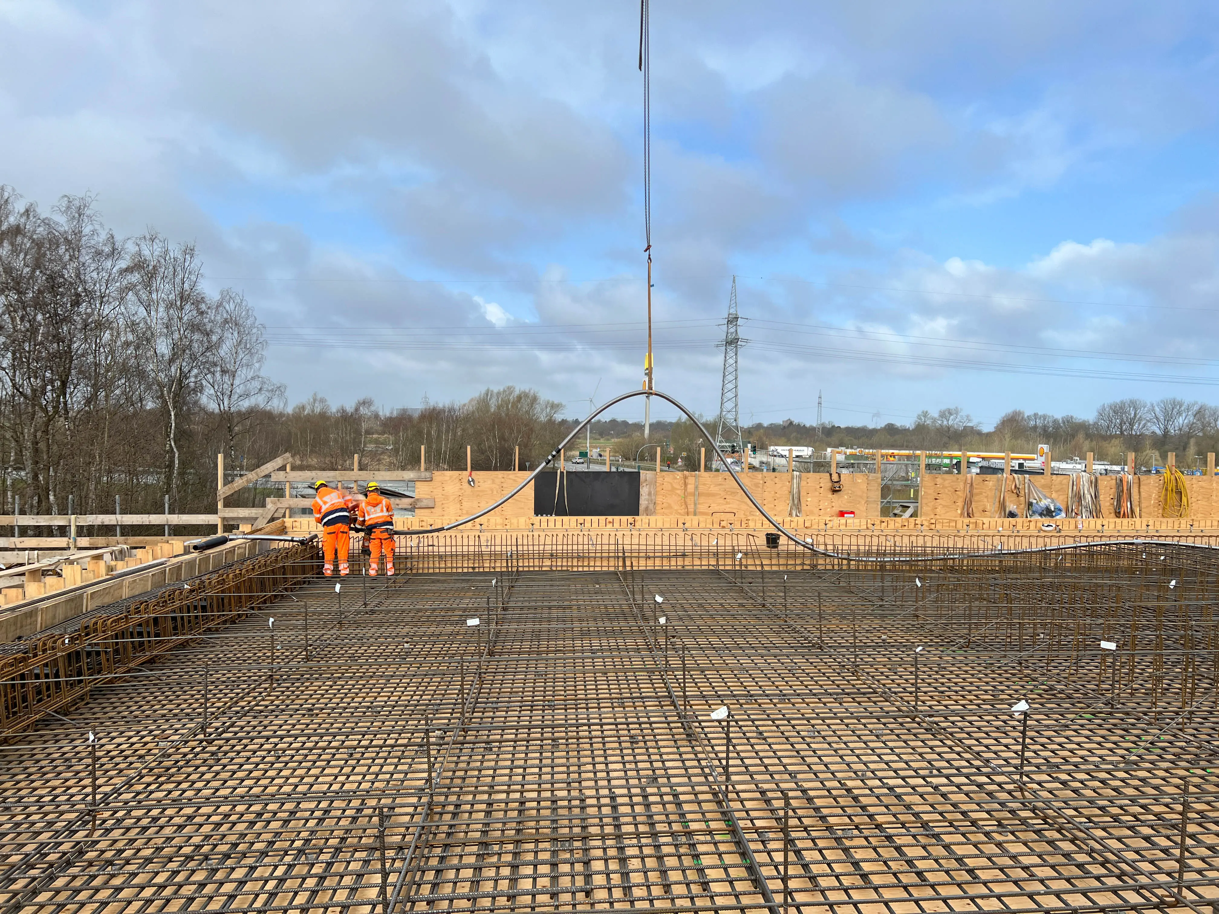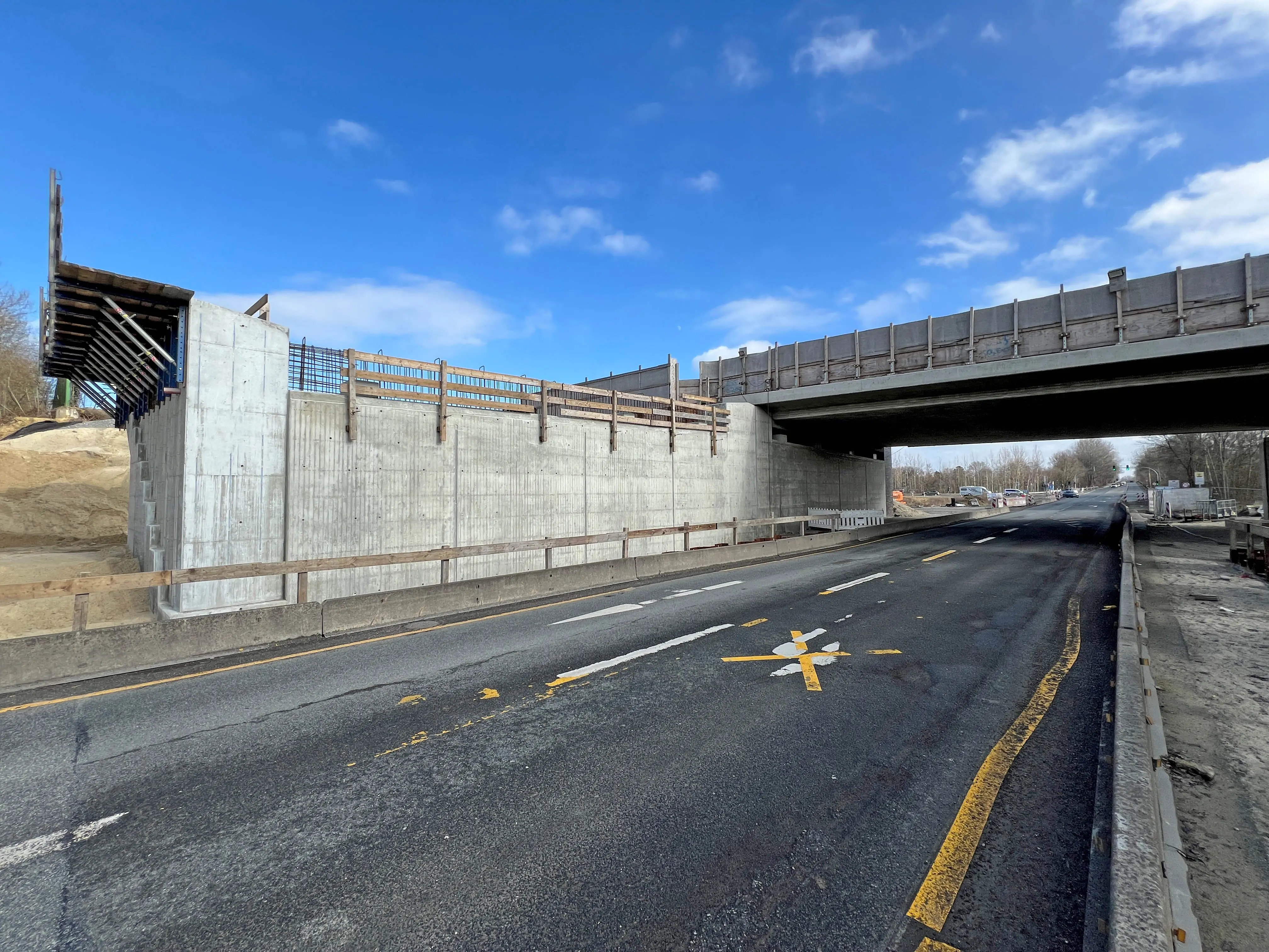 - Die Betonage des nördlichen Widerlagers und des zweiten Brückenpfeilers zwischen den Fahrbahnen der B71 laufen.