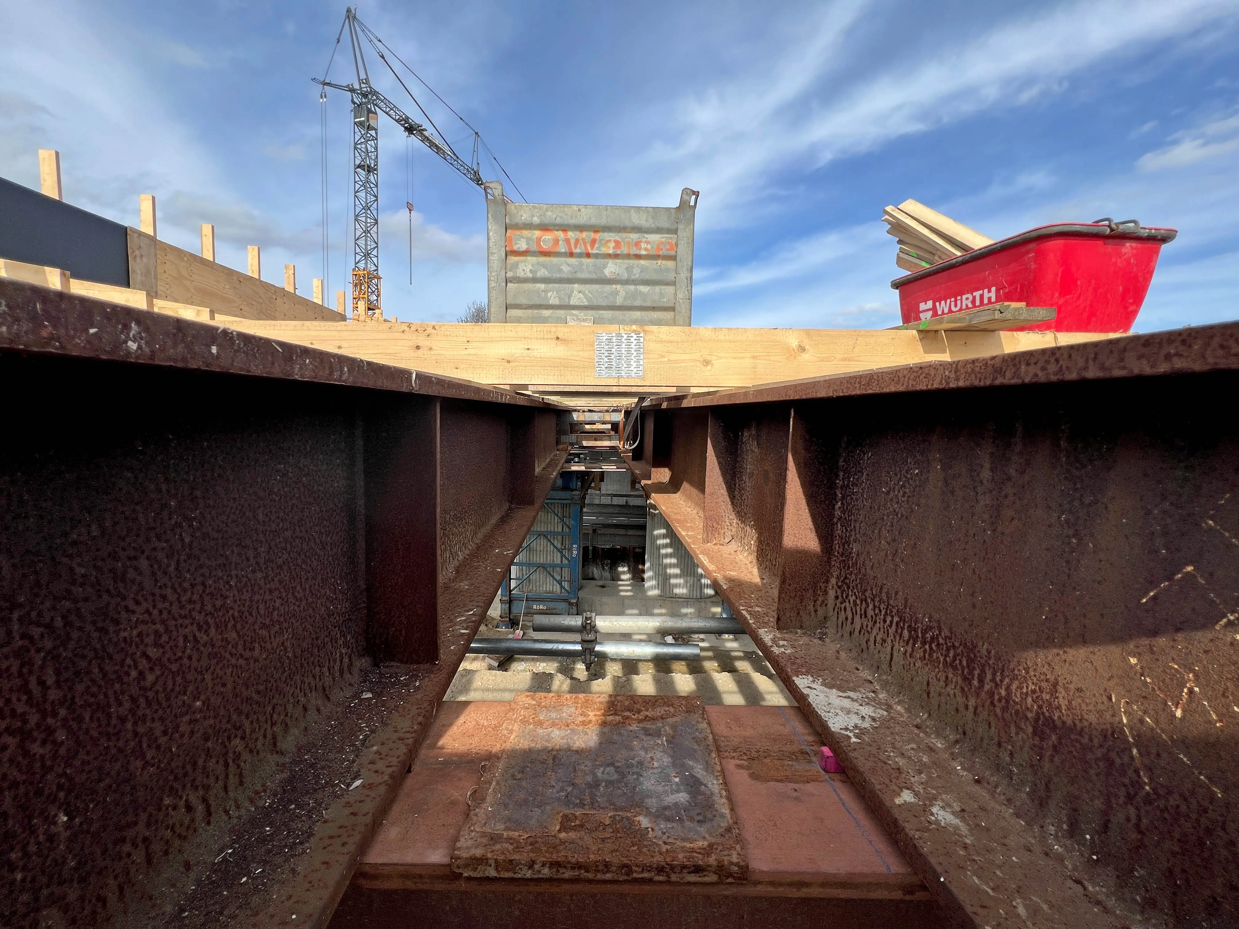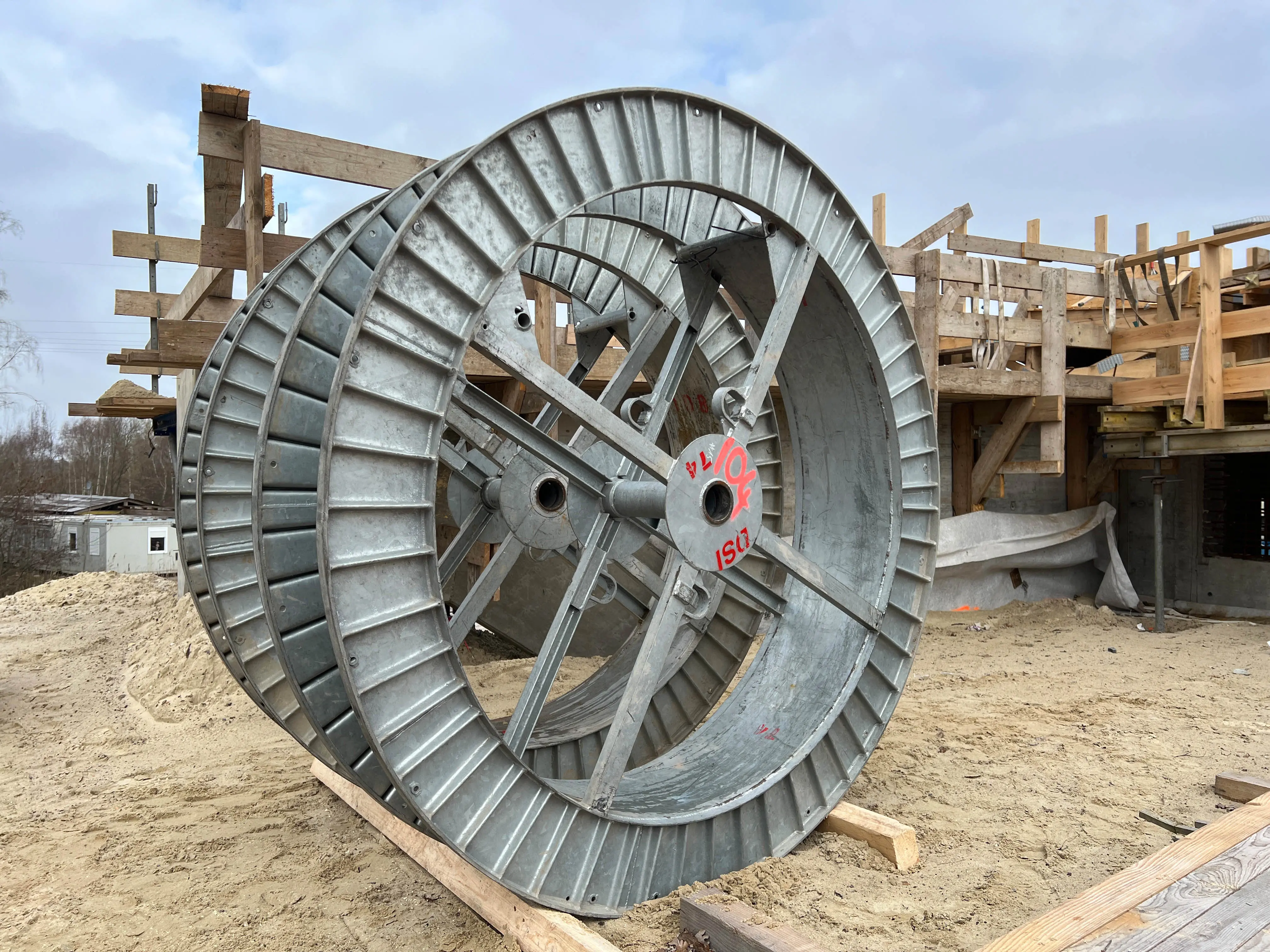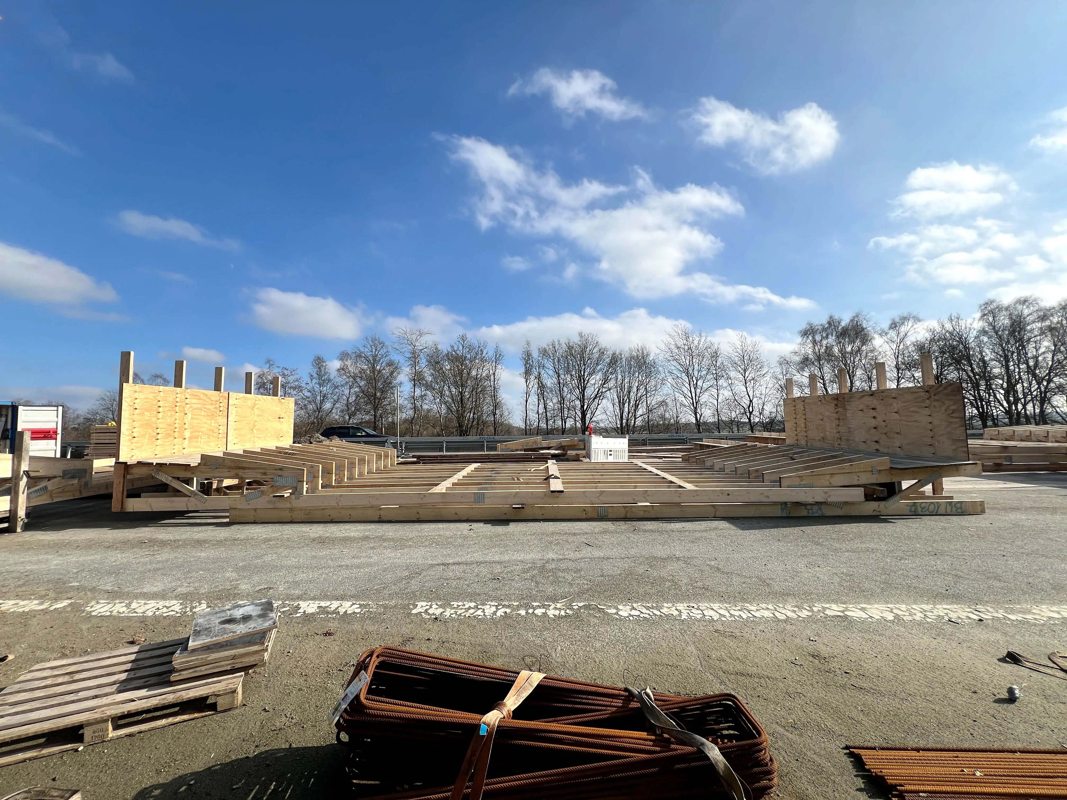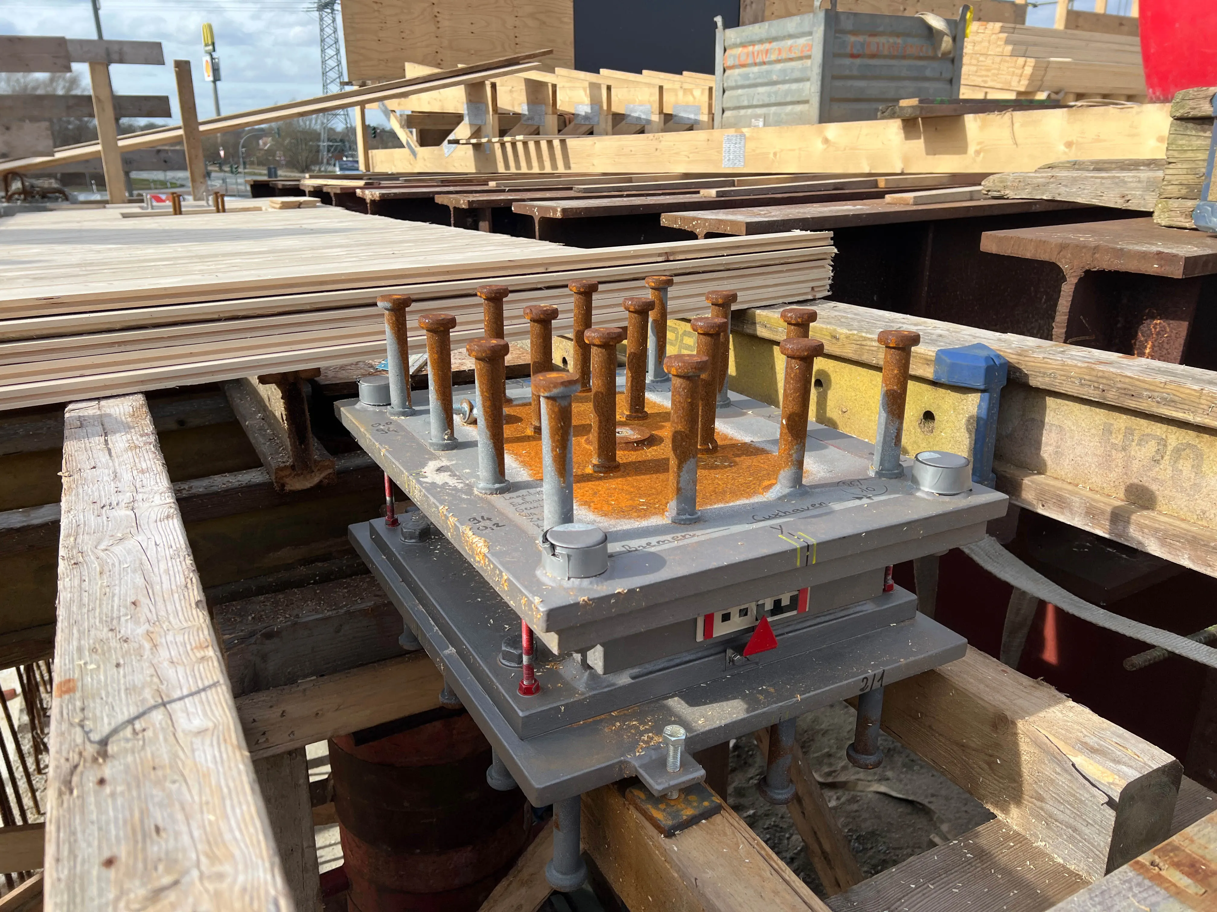- Die Schalung für einen von insgesamt vier Mittelpfeilern steht.