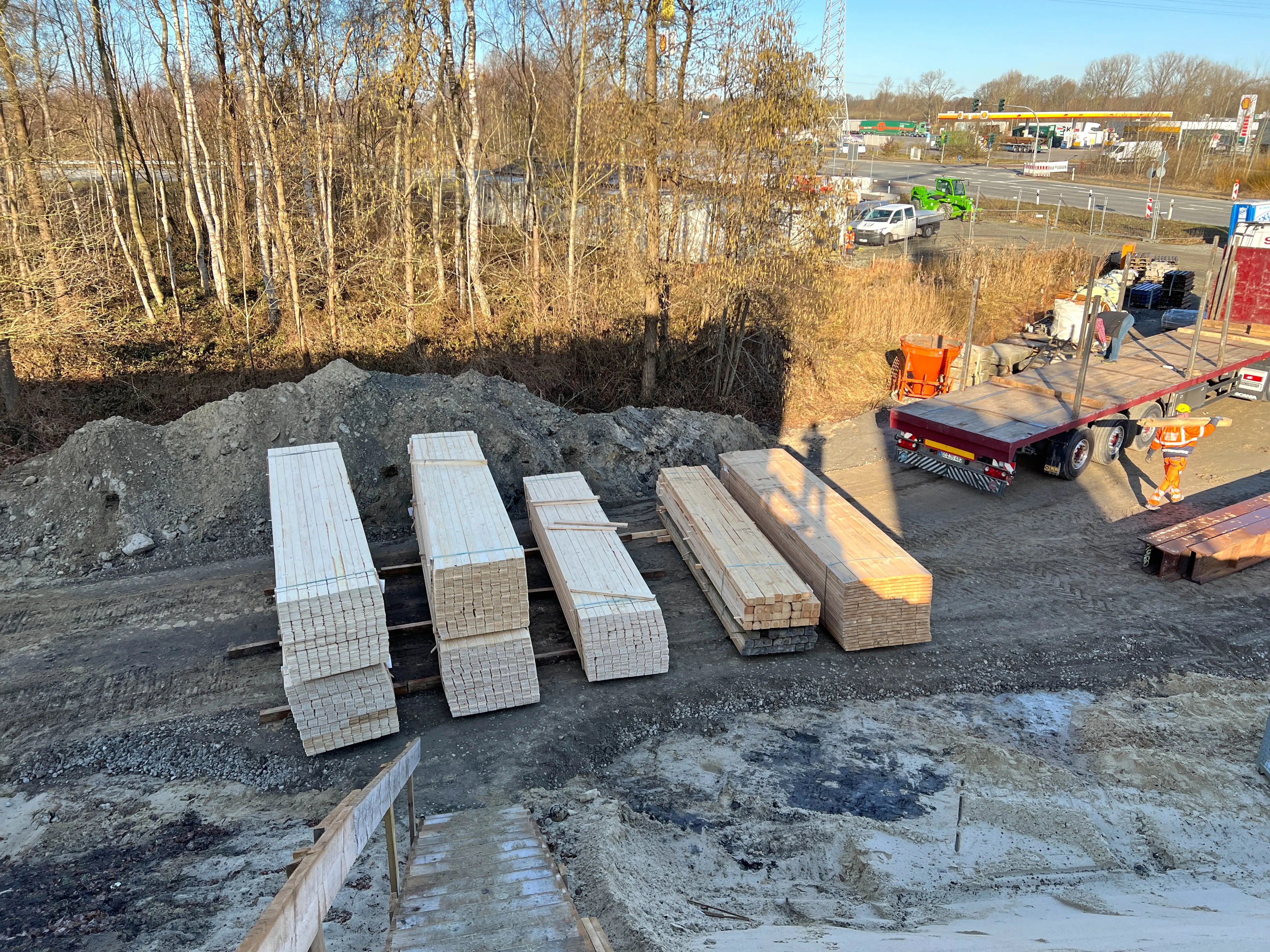 - Die Bauflächen östlich der Brücke sind geschottert. Dort wird später unter anderem der ausgebaut Sand zwischengelagert.