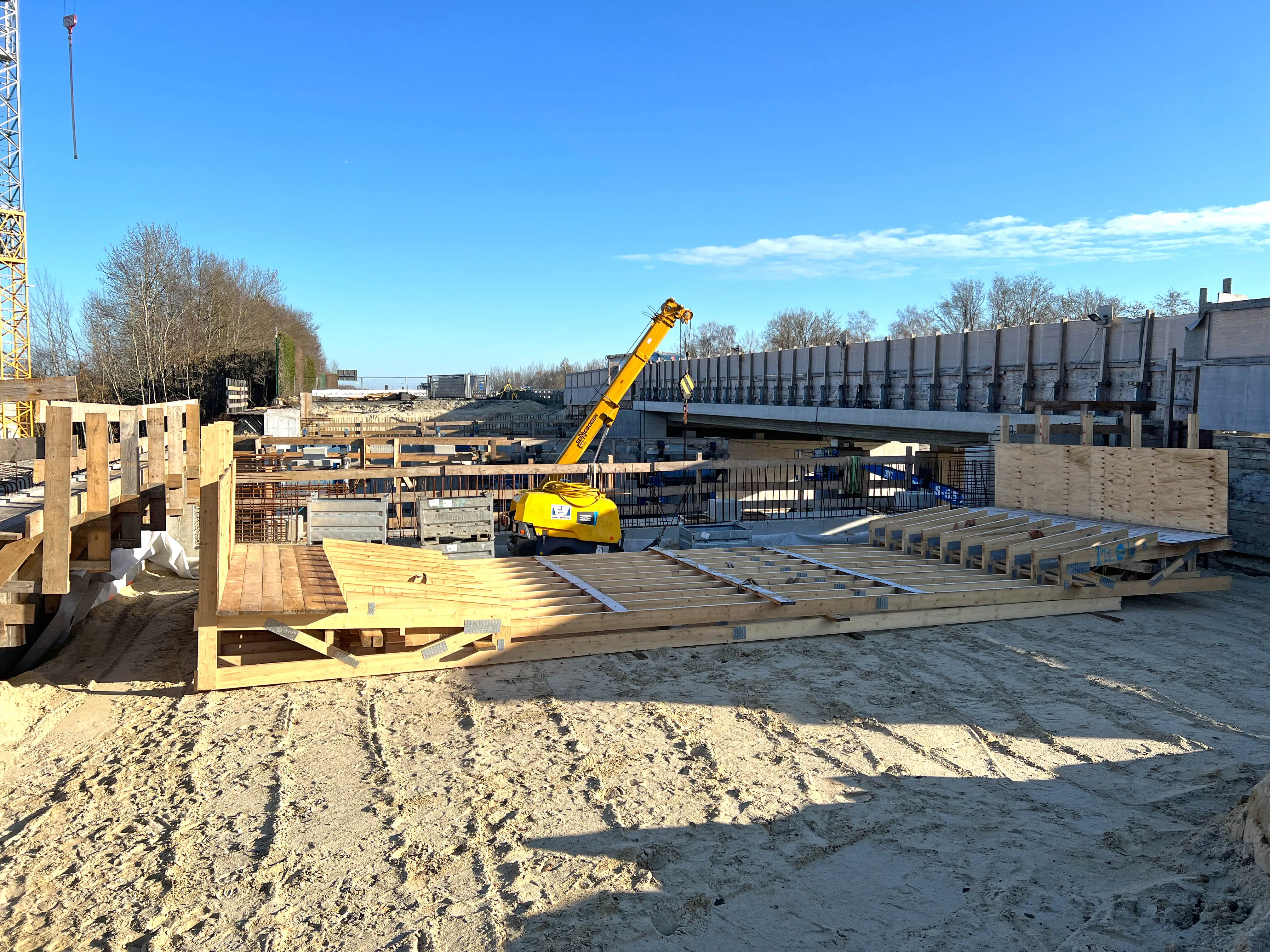 - Die Schalung für das nördliche Widerlager ist nahezu vollständig montiert.