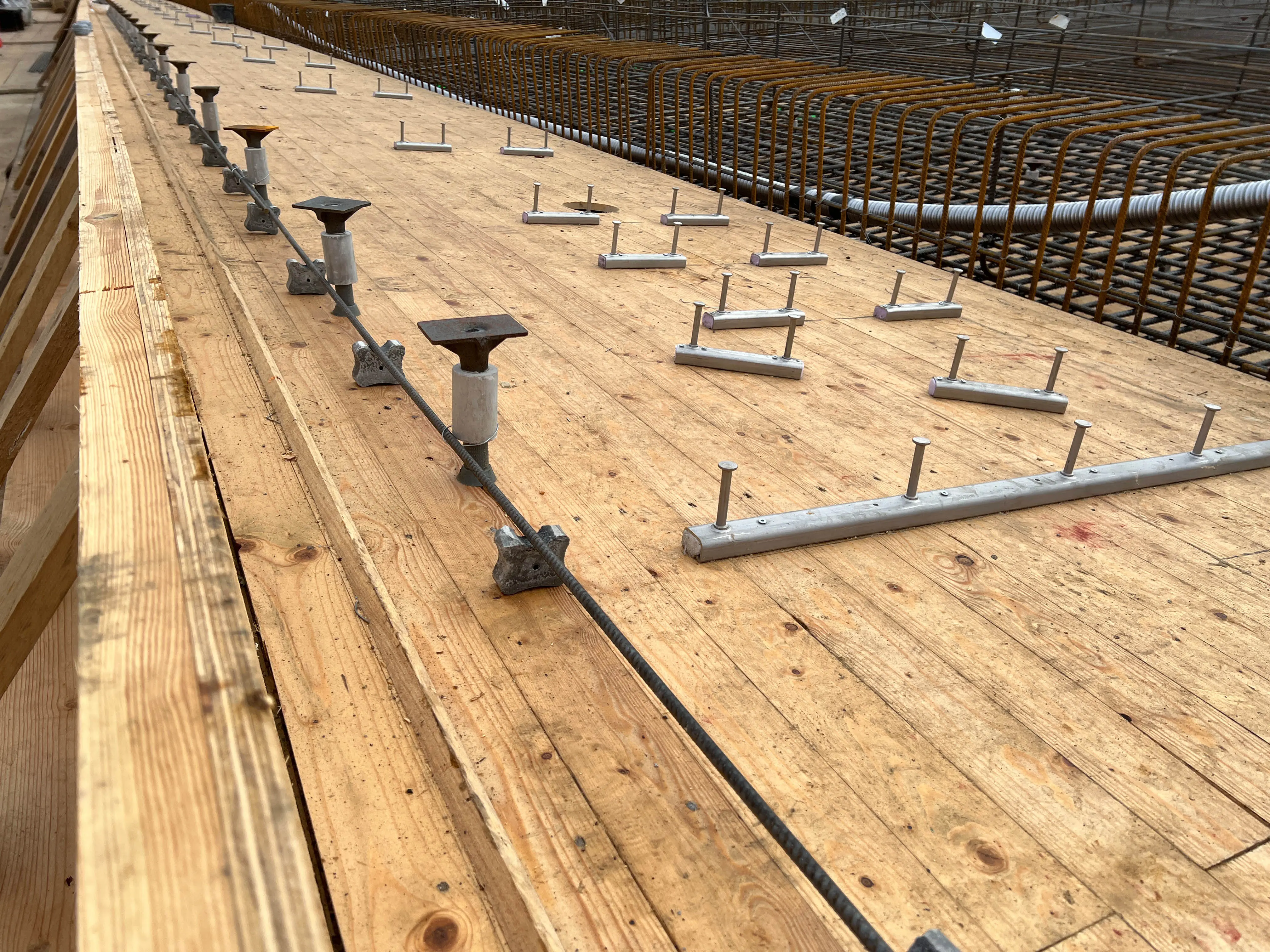 - Die Verschalungen für das Betonieren des südlichen Widerlagers und des dritten Mittelpfeilers stehen.