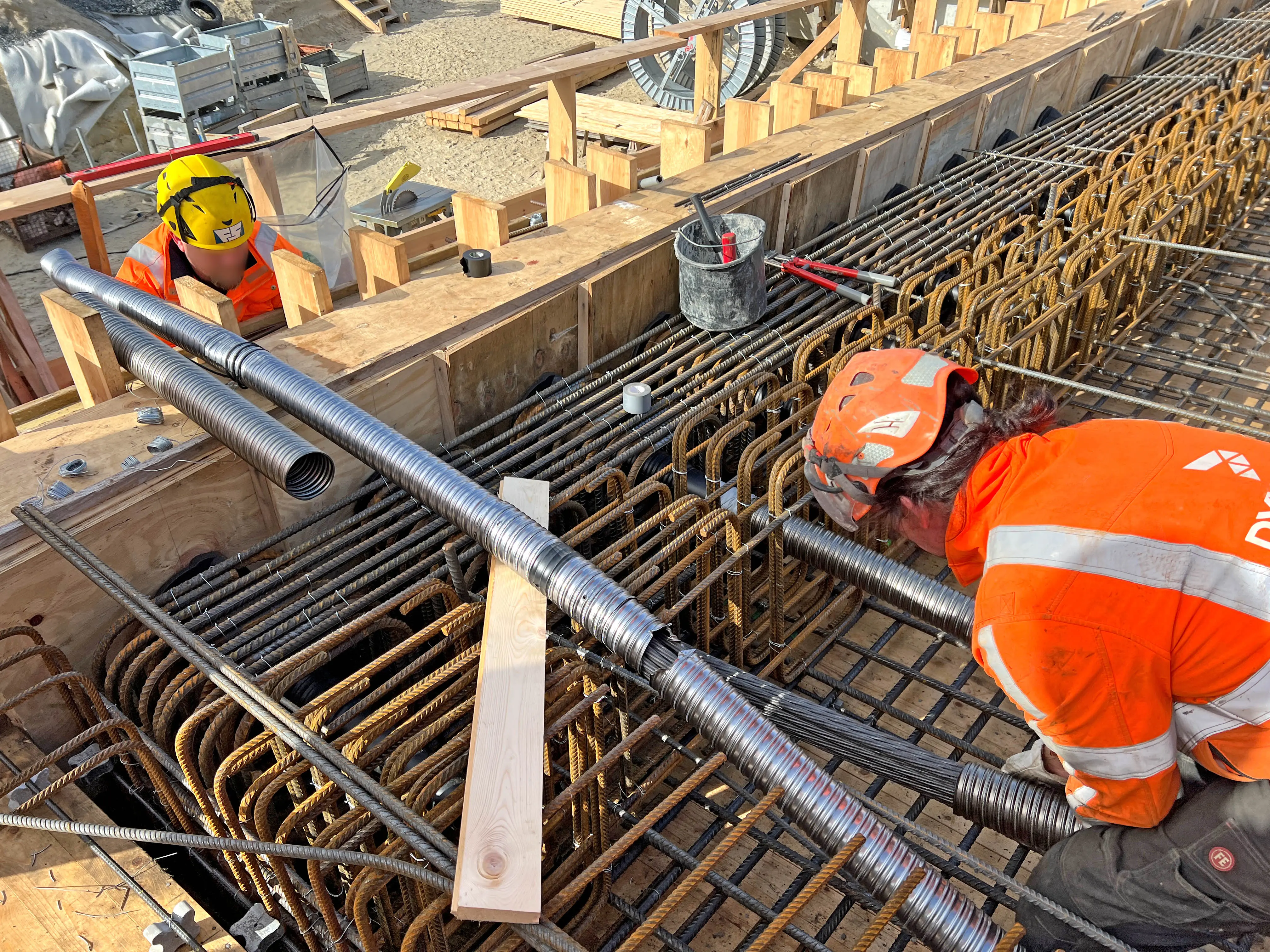 - Die vorbereitete Stahlbewehrung wird von Bauingenieurinnen der Autobahn GmbH überprüft.
