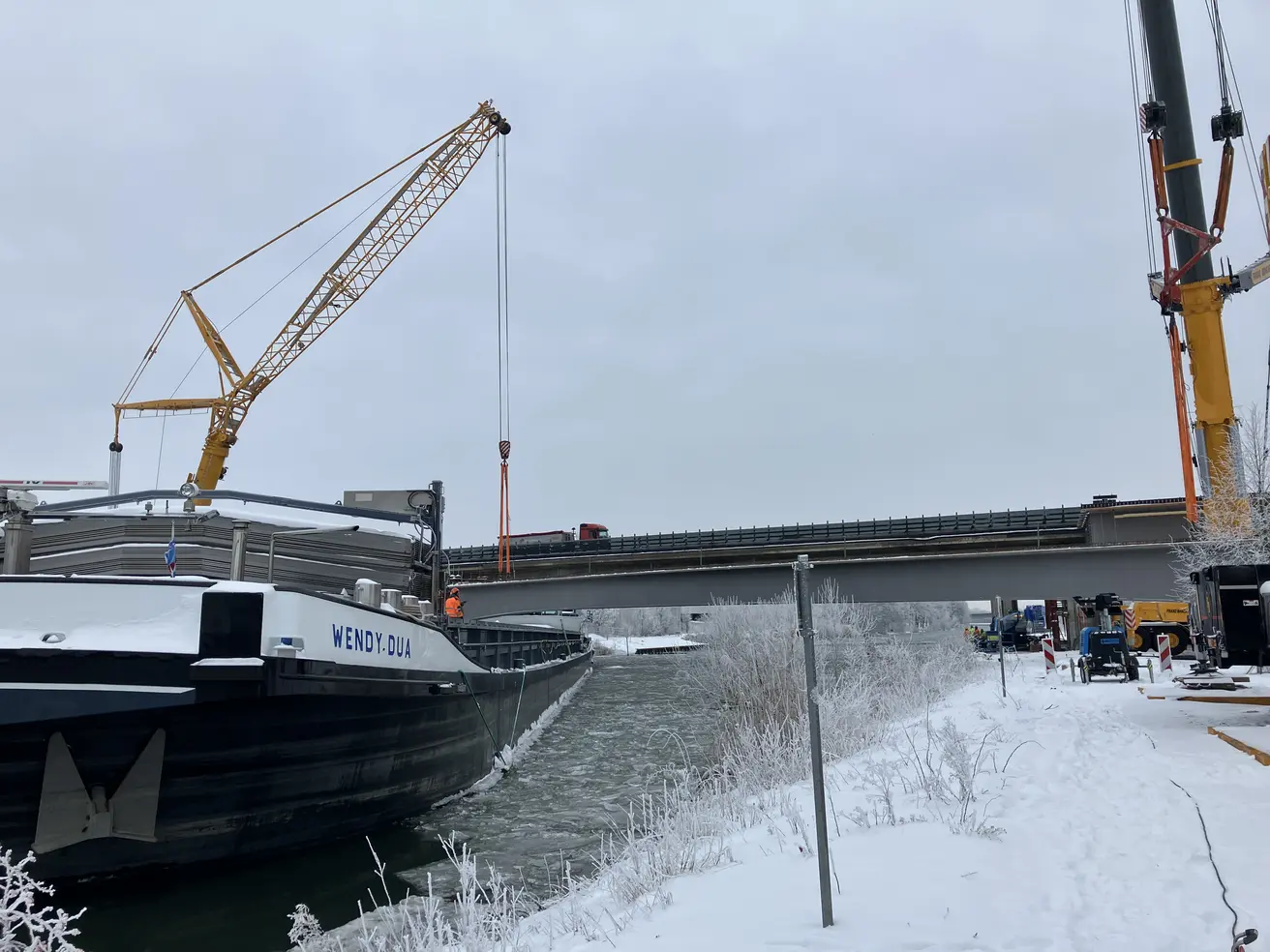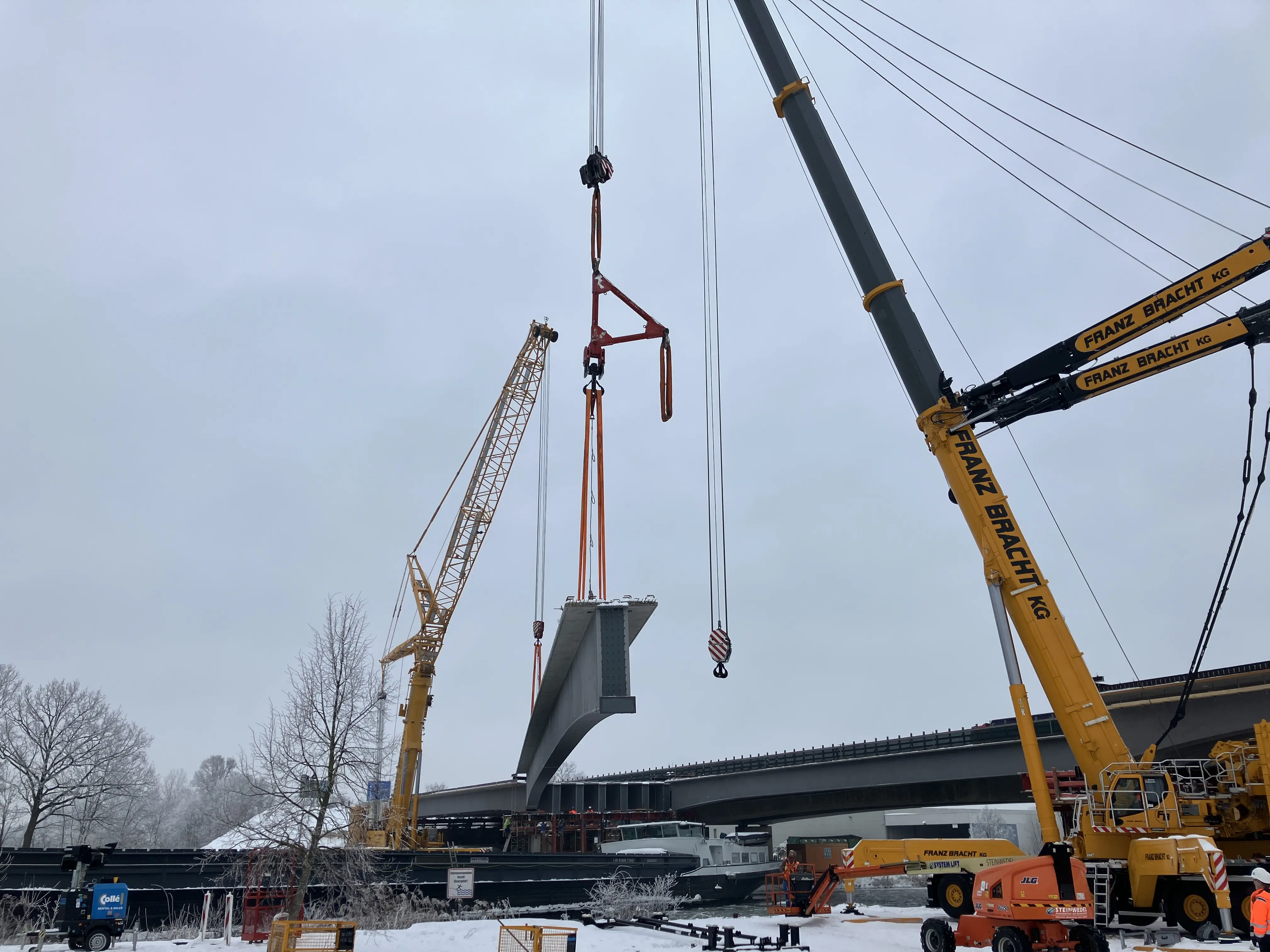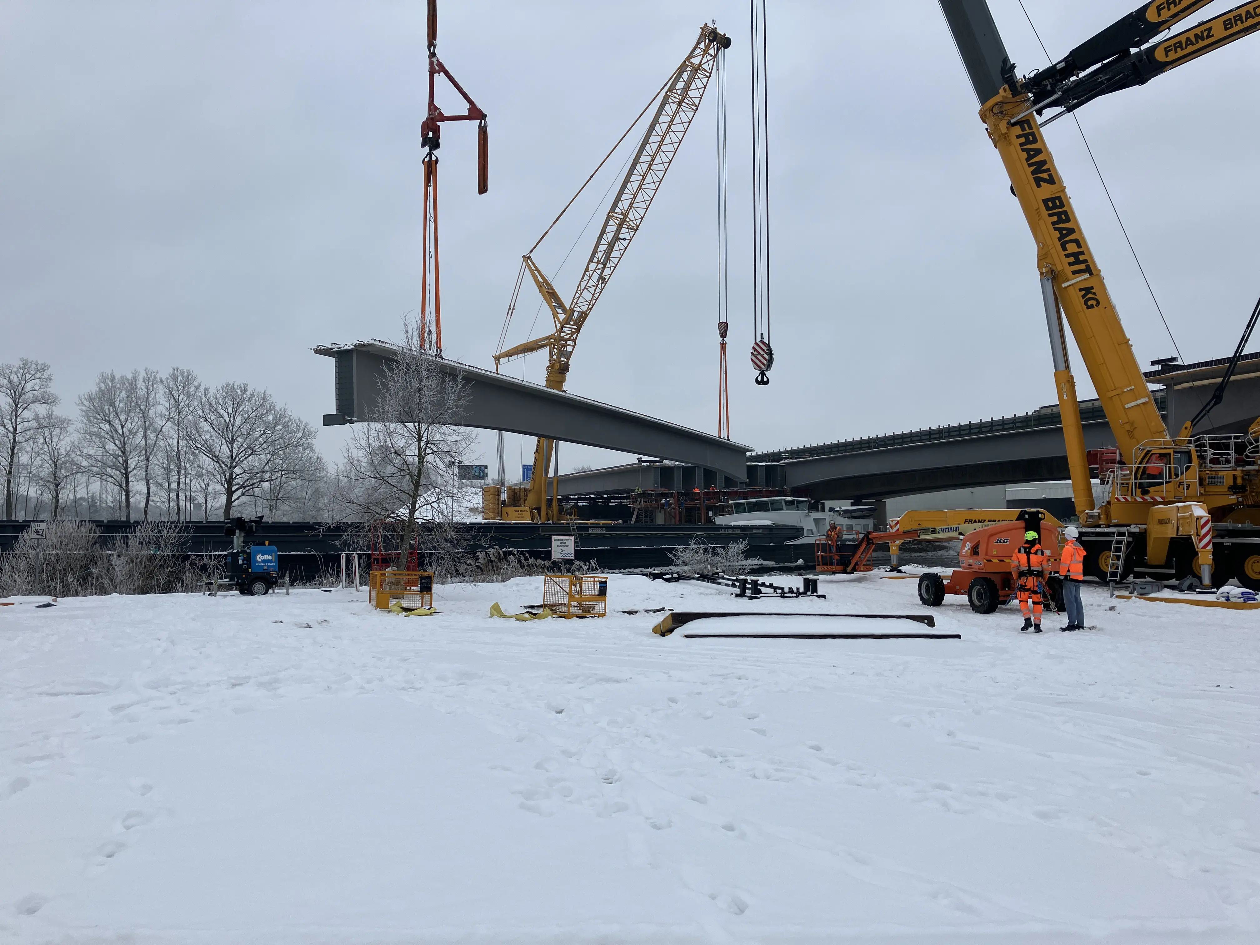 Im Baufeld über dem Mittellandkanal wurden sieben Fertigteilträger mit Hilfe von drei 500-Tonnen-Kränen eingehoben. Jeder VfT-Träger ist rund 60 Meter lang und wiegt etwa 82 Tonnen. Damit ist der Überbau der westlichen Brückenhälfte nun geschlossen.