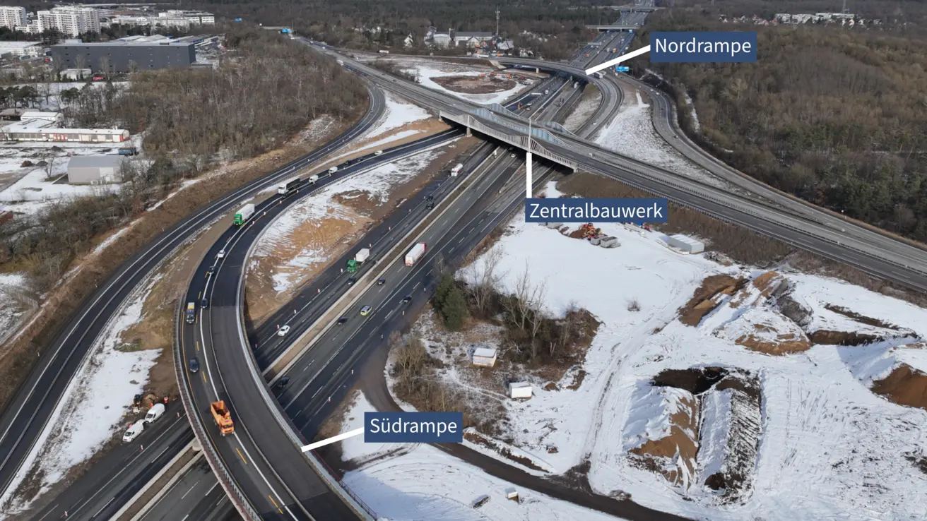 Neben der vorlaufenden Baufeldfreimachung mit einem Großteil der Kampfmittelsondierungen sind dies u.a. die Verschiebung der Rampe A67 in Fahrtrichtung Mannheim und der Abbruch der Überführungsbauwerke an der Nordrampe und den beiden Zentral-Teilbauwerken.