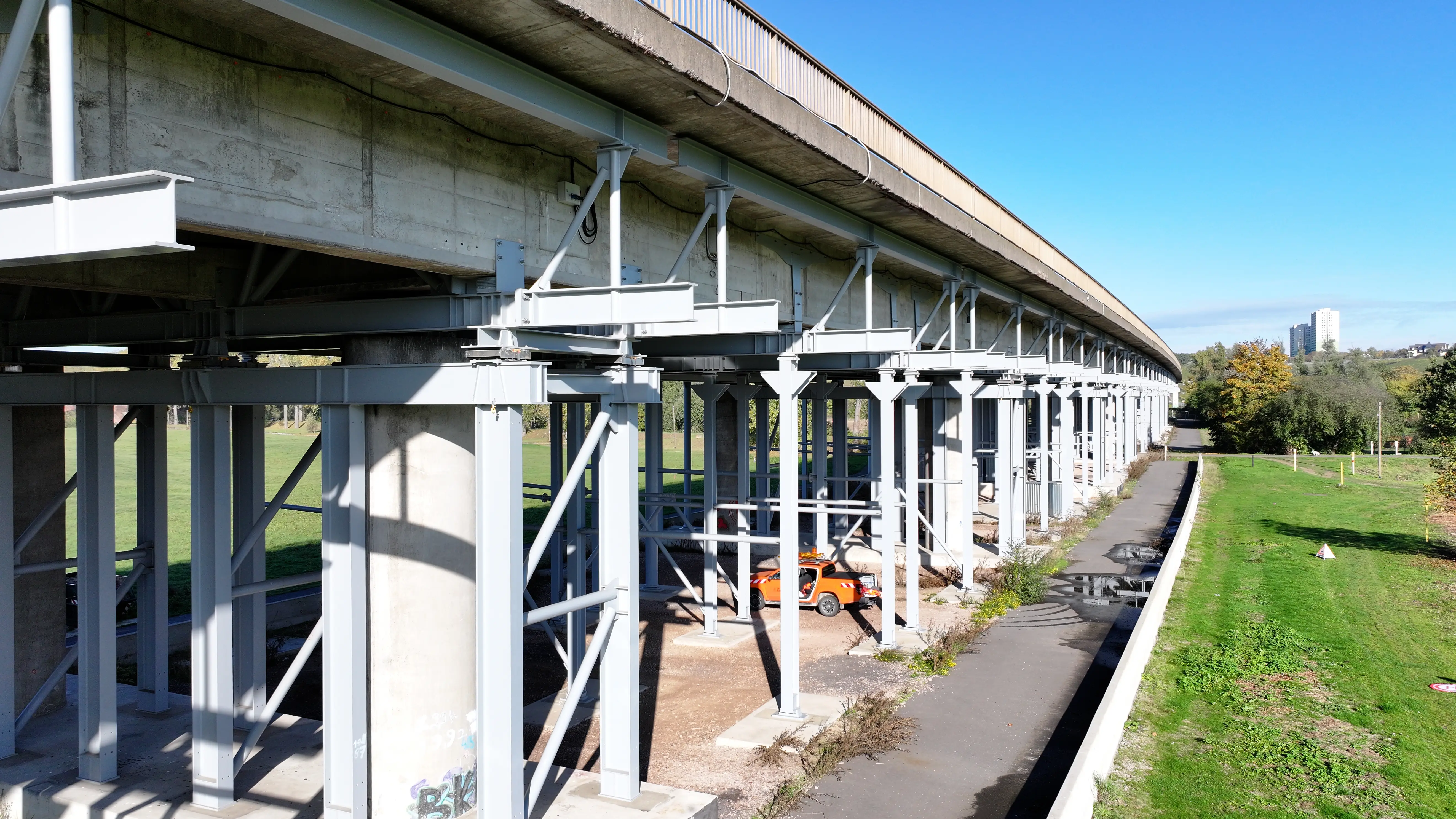 - Installation eines 24/7/365 Monitoringsystems im Bereich der Vorlandbrücke inkl. Bahnquerungzur Erfassung von sich ggfs. einstellenden Rissen. Bisher jedoch unauffällig.