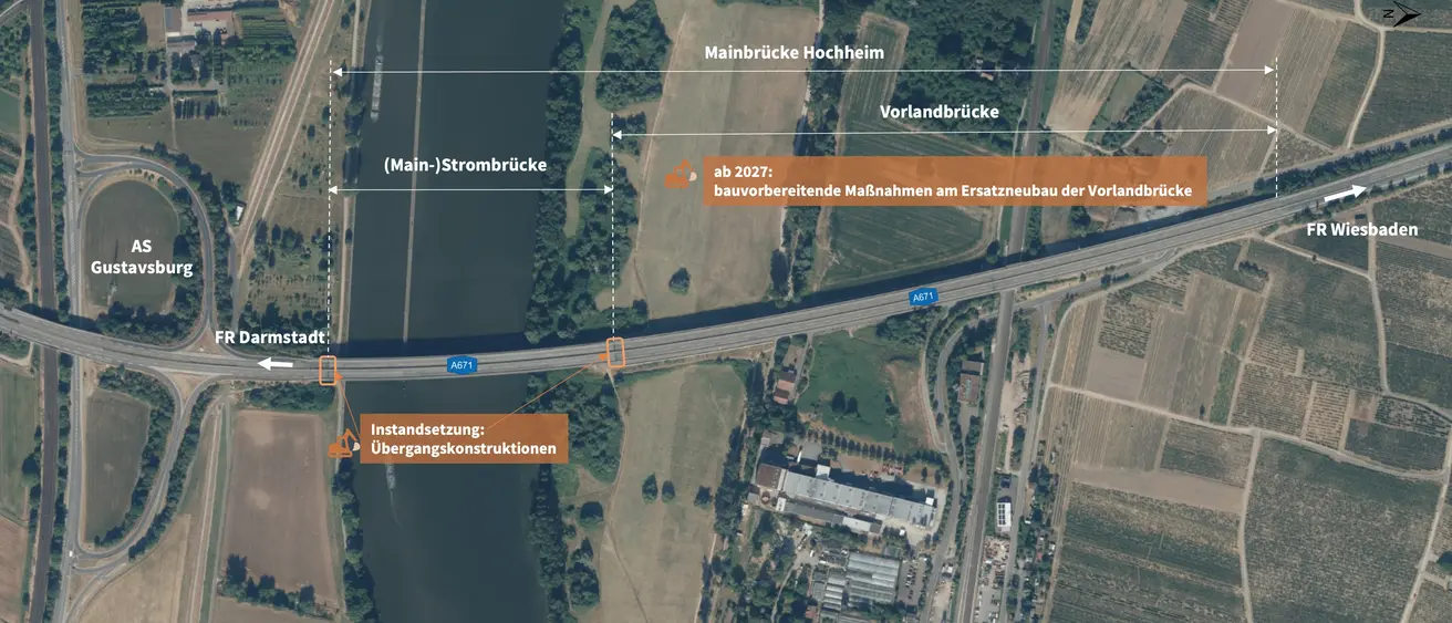Voraussichtlich ab 2027 beginnen vorbereitende Maßnahmen zum Ersatzneubau der Vorlandbrücke Hochheim.