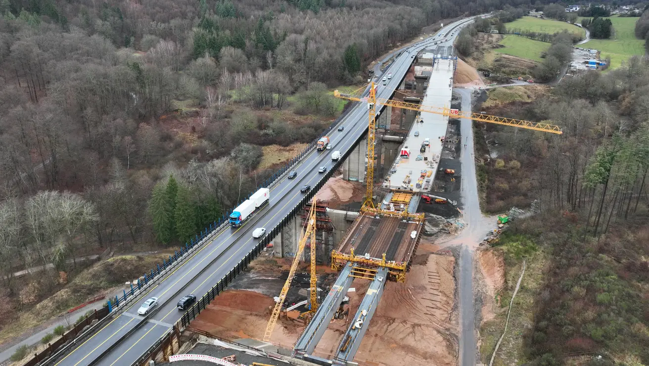 Der Verschub des Überbaus der späteren Richtungsfahrbahn Saarbrücken, welcher momentan auf Behelfsstützen steht, soll bis Ende 2026 abgeschlossen sein und dann auf den neuen Unterbauten (Pfeilern und Widerlagern) der Richtungsfahrbahn Saarbrücken liegen.