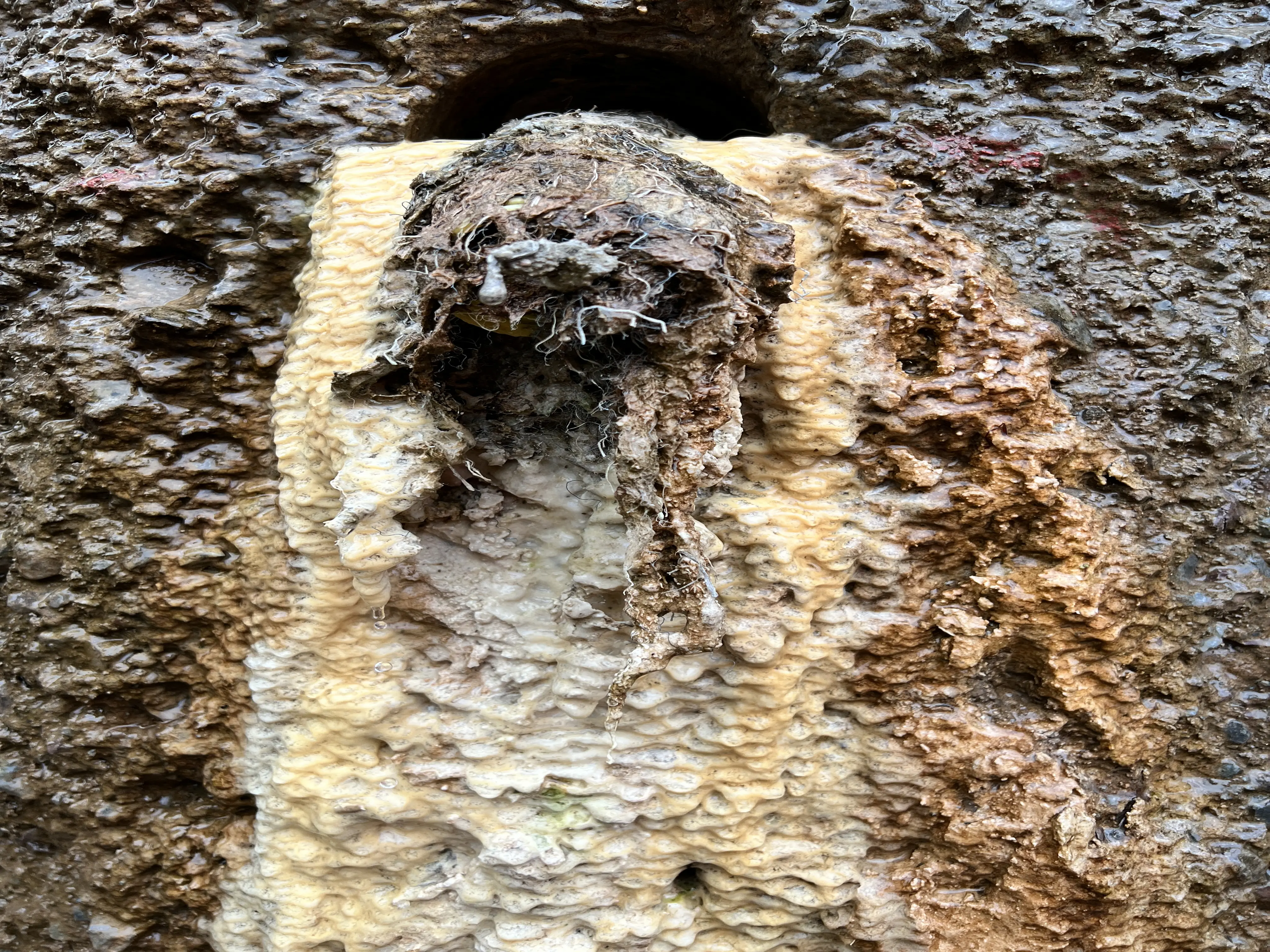 Am Widerlager gegenüber ist die Bohrpfahlwand bereits fertig. Hier ist der Hang nicht ganz so hoch, das Bauwerk darum kleiner. Nach dem regenreichen Oktober sieht man gut, welche Funktion die Entwässerungslöcher habe, die an der Südseite gerade gebohrt werden. Es tropft und tropft – an manchen Stellen hat sich Moos gebildet, an anderen bilden Kalkablagerungen erste bizarre Formen. „Das Wasser muss raus, damit der Druck auf die Wand nicht zu groß ist“, erklärt der Ingenieur. Ein paar Schritte weiter klammern sich Pflanzen zwischen schwarzem Gewebe an den Hang. Hier sind Podeste aus bewehrter Erde errichtet worden, um zum Beispiel Standflächen für Krane und Bohrgeräte im Steilen hang herzustellen. „Bewehrte Erde“ wird ein Verfahren genannt, bei dem mit Hilfe von stabilen Kunststoffmatten, so genannten Geogittern, Boden so aufeinander geschichtet wird, dass eine stabile Grundlage für spätere Arbeiten oder Bauwerke entsteht. Einige dieser modellierten Flächen verschwinden im Zuge der Bauarbeiten wieder, anderen bleiben bestehen – zum Beispiel, um später auch unter den beiden Teilbauwerken Bewegungsflächen zu haben, auf denen Prüfgeräte zum Einsatz kommen können.