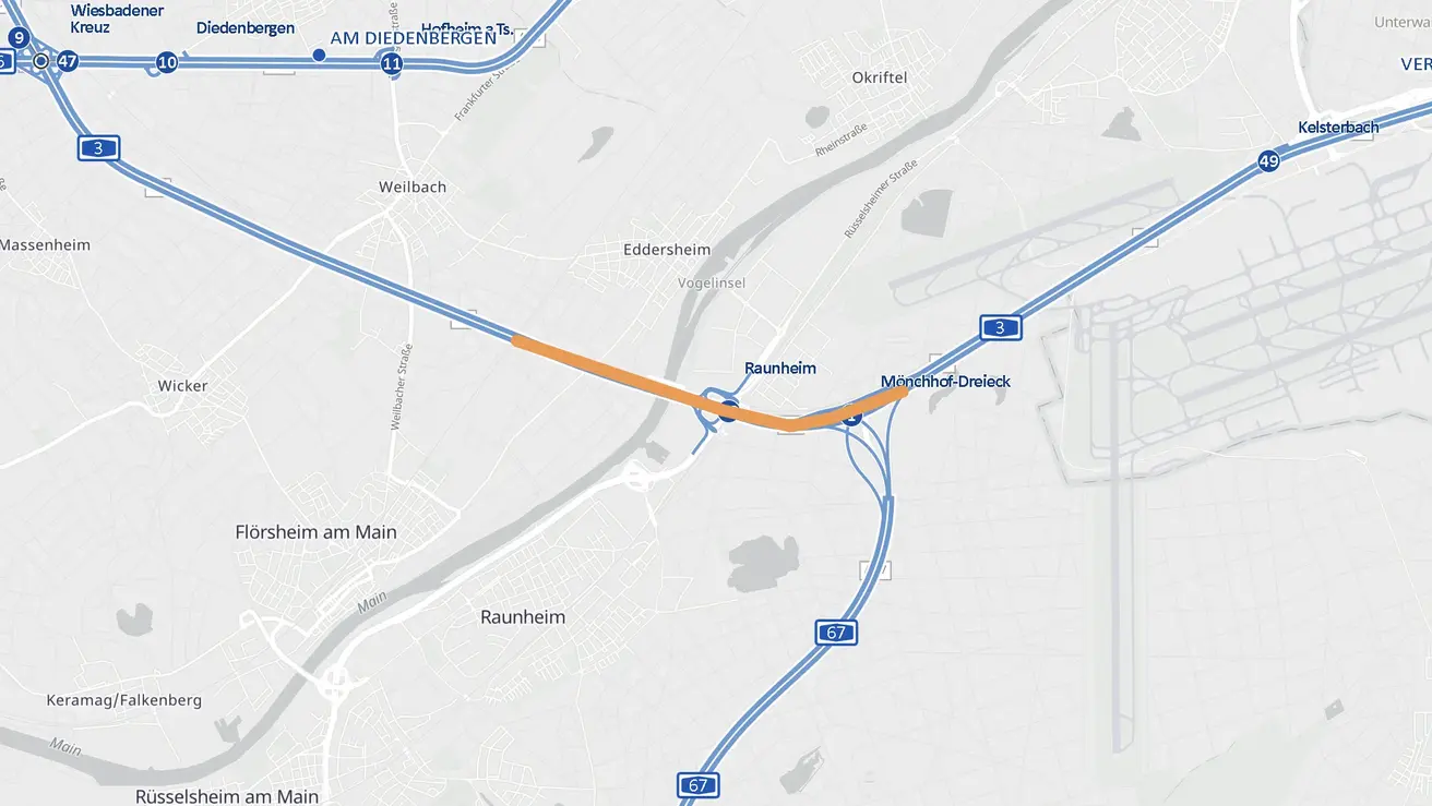 Die Maßnahme zur grundhaften Erneuerung der A3 zwischen Mönchhofdreieck und Wiesbadener Kreuz wird in zwei Bauabschnitten ausgeführt. Der erste Bauabschnitt (8,7 km) wurde bereits 2024 abgeschlossen. Die Autobahn GmbH investierte hier rund 13,5 Millionen Euro. Der zweite Bauabschnitt beginnt voraussichtlich ab Montag, 11. Mai 2026. Bereits ab 13. April 2026 finden die Vorarbeiten statt zur Herstellung der Mittelstreifenüberfahrten, im Anschluss wird die Baustellenverkehrsführung eingerichtet.