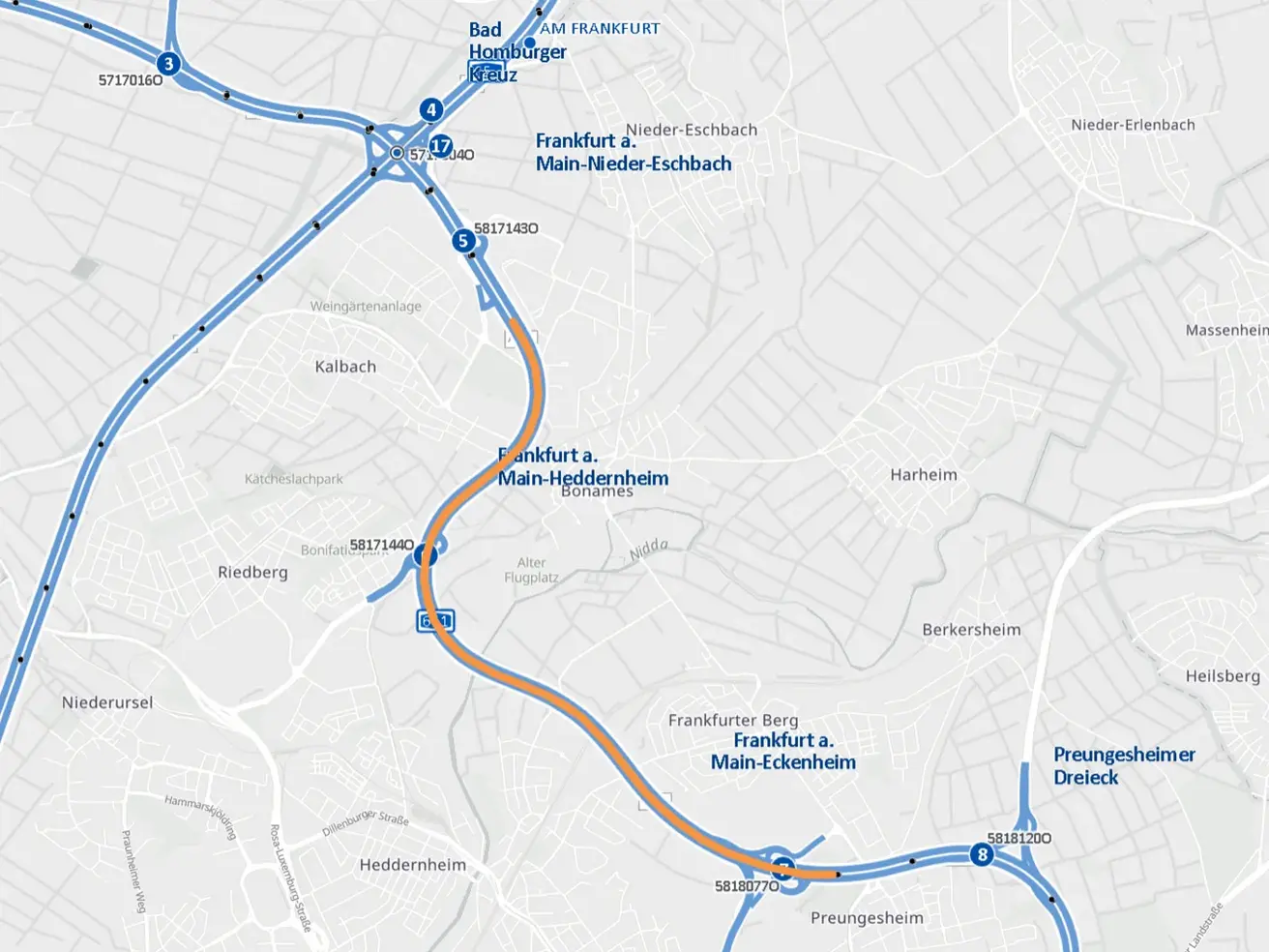 Bereits im Jahr 1975 wurde die A661 zwischen der Anschlussstelle Frankfurt-Nieder-Eschbach und der Anschlussstelle Frankfurt-Eckenheim fertiggestellt. Die durchschnittliche tägliche Verkehrsstärke liegt hier aktuell bei rund 83.000 Fahrzeugen, 5% davon entfallen auf den Schwerlastverkehr.