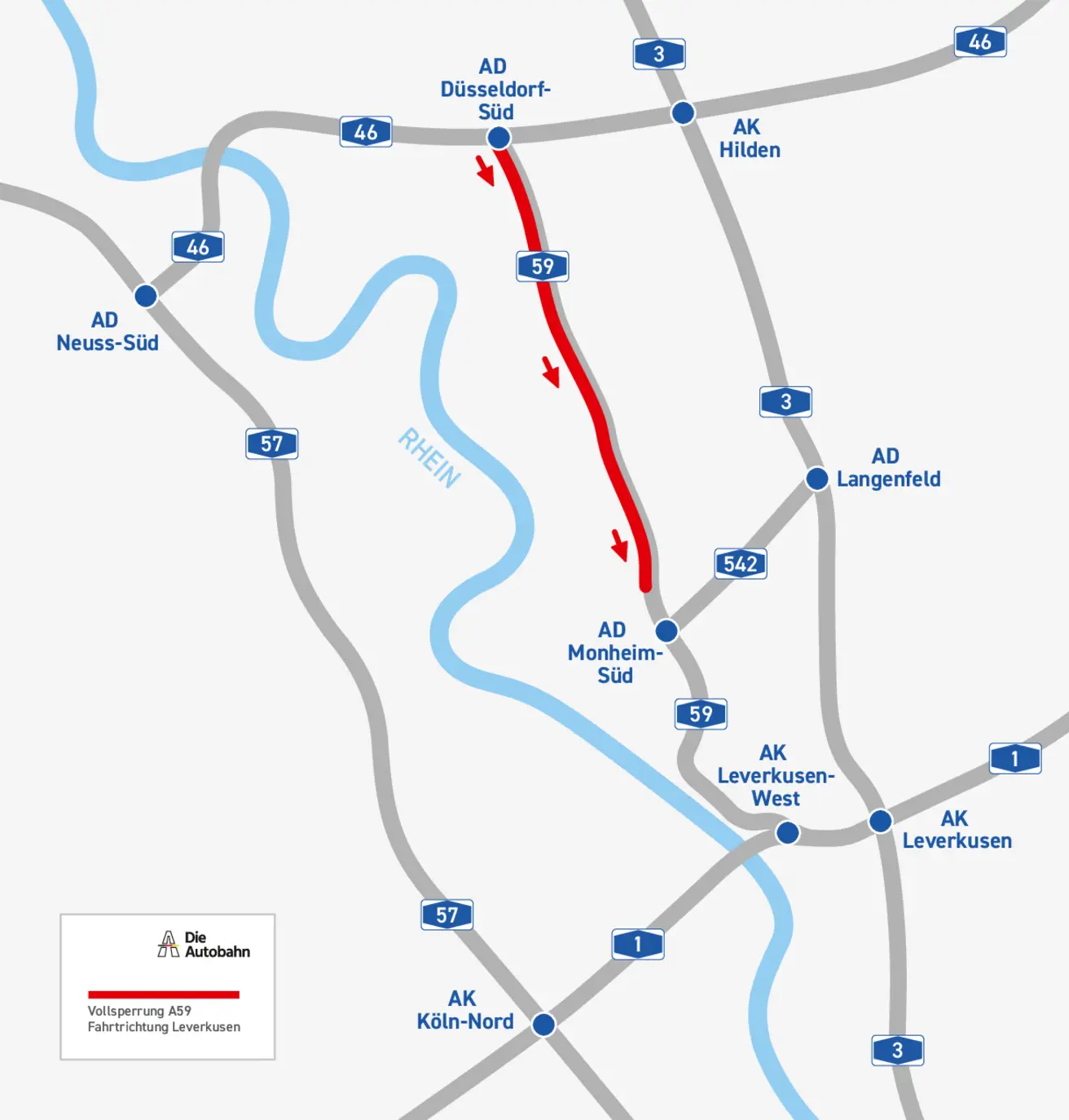 Während der etwa achtmonatigen Bauzeit in der ersten Bauphase ist die A59 zwischen dem Autobahndreieck Düsseldorf-Süd und der Anschlussstelle Monheim in Fahrtrichtung Leverkusen vollgesperrt. Während dieser Zeit müssen die Verkehrsteilnehmenden auf Umleitungsstrecken ausweichen.