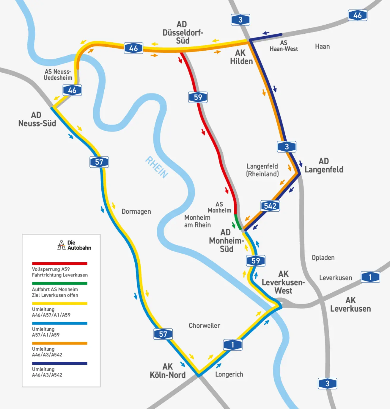 Die weiträumige Umleitung führt über die A46, A3 und die A542 beziehungsweise über die A46, A57, A1, A59. Die Verkehrsführung wird dabei unter anderem im Übergangsbereich A3/A542 im Autobahndreieck Langenfeld optimiert, so dass der Verkehr dort besser abfließen kann.