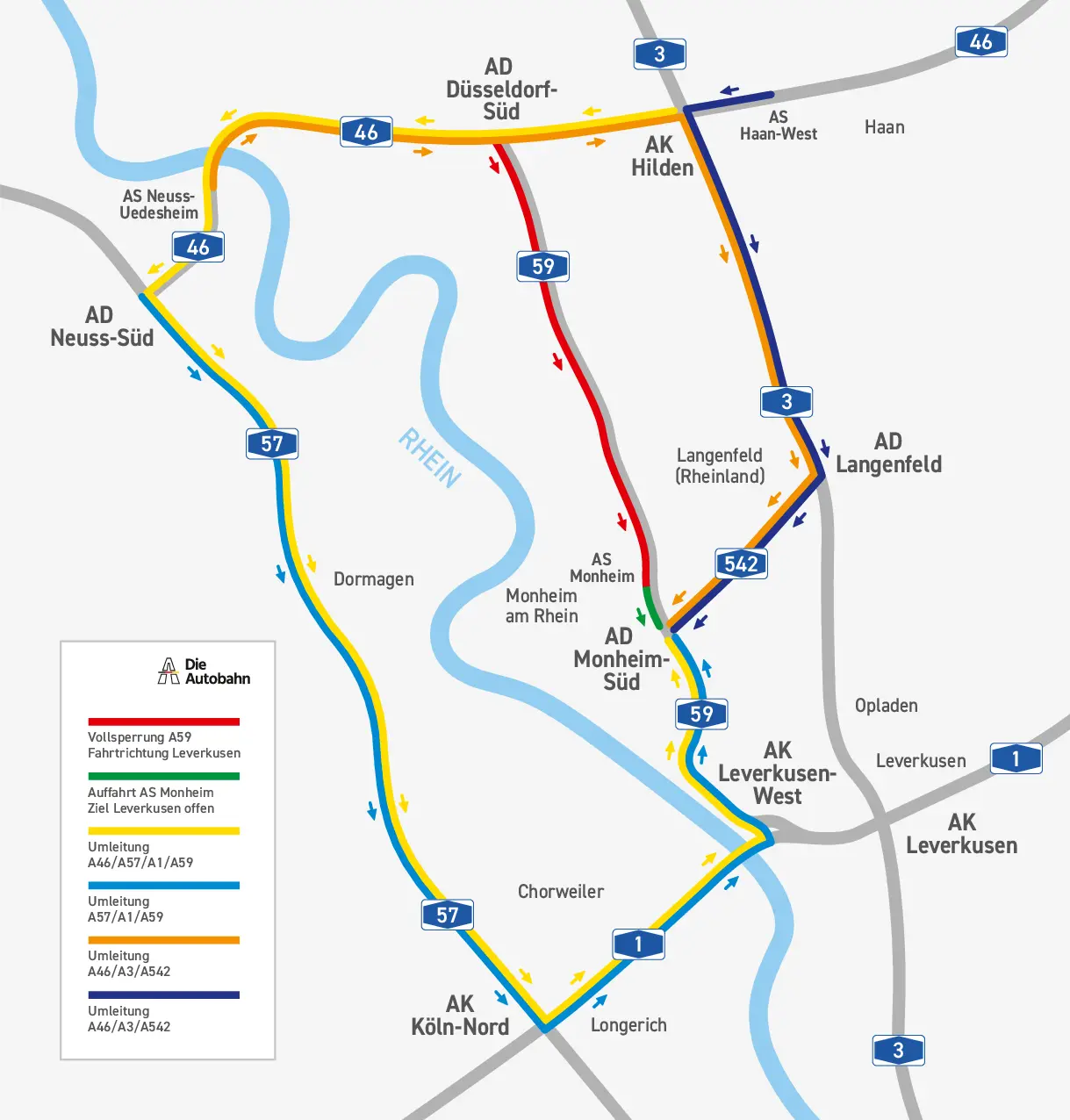 Die lokale Umleitung aus Benrath führt über die Richrather Straße, Hildener Straße, Berghausener Straße, Düsseldorfer und Knipprather Straße zur Anschlussstelle Monheim. Dort ist die Weiterfahrt in Fahrtrichtung Leverkusen möglich. Eine weitere Umleitung führt zur Anschlussstelle Düsseldorf-Benrath von Am Schönenkamp oder Hülsenstraße. Diese Umleitung führt in Fahrtrichtung Düsseldorf über das Autobahndreieck Düsseldorf auf die A46. Ab hier kann dann die weiträumige Umleitung genutzt werden.