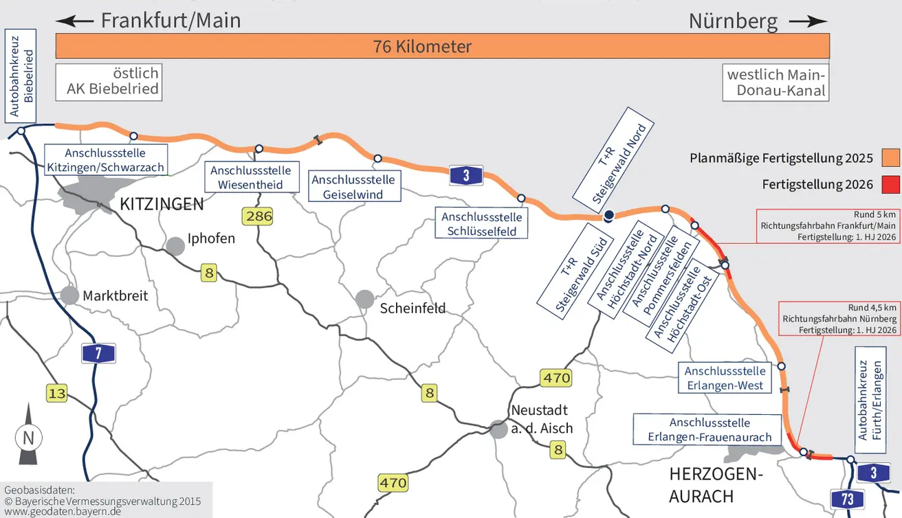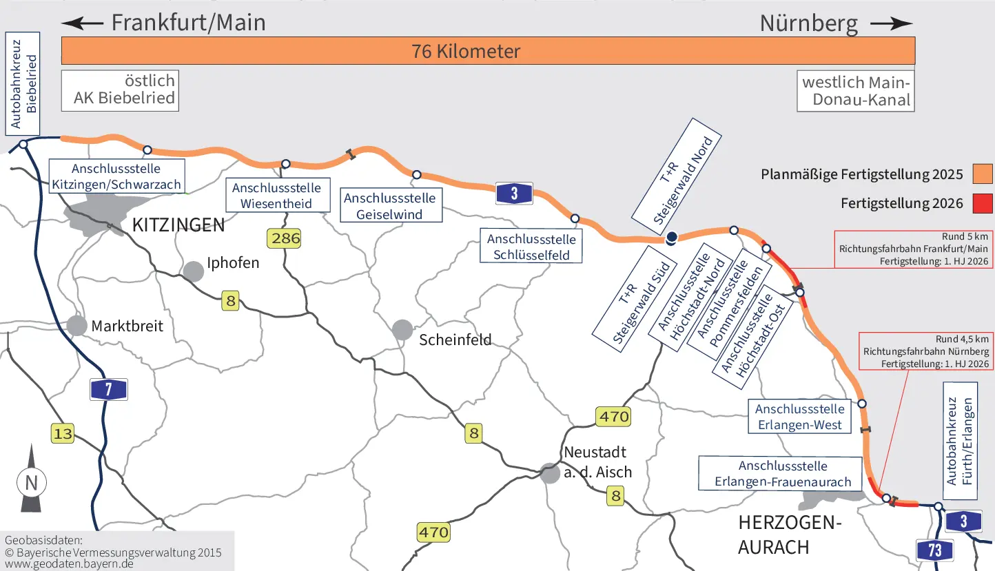 Die Fertigstellung der Gesamtstrecke ist greifbar. Verzögerungen betreffen lediglich zwei Abschnitte: Die Richtungsfahrbahn Frankfurt/Main zwischen Pommersfelden und Höchstadt-Ost (rund 5 Kilometer) sowie die Fahrbahn Richtung Nürnberg im Bereich der Anschlussstelle Frauenaurach (rund 4,5 Kilometer) werden voraussichtlich im ersten Halbjahr 2026 abgeschlossen. Die jeweils gegenüberliegenden Fahrtrichtungen sind bereits befahrbar. Verzögerungen durch höhere Gewalt, insbesondere beim Bau der Aurachtalbrücke (ca. 300 Meter) und der Brücke über die Flutmulde Aisch (ca. 120 Meter), konnten nicht vollständig kompensiert werden. Auftraggeber und Auftragnehmer haben sich daher auf eine vertragliche Anpassung des Zeitplans verständigt.
