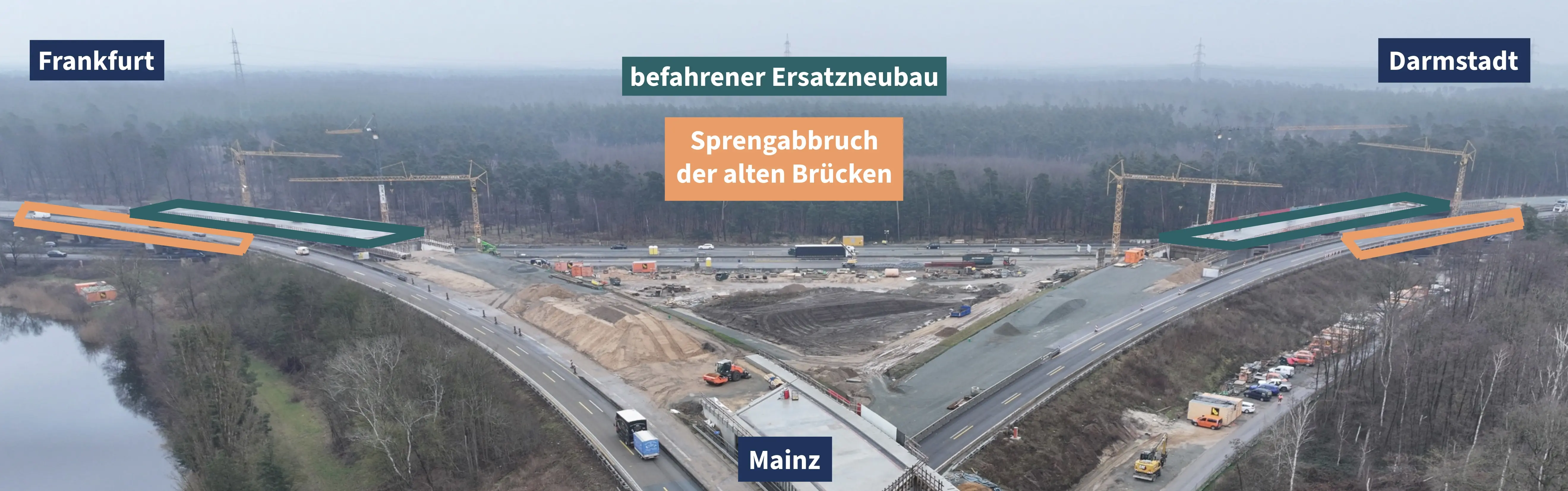 Wichtiger Schritt für die Erneuerung der Verkehrsinfrastruktur am Rüsselsheimer Dreieck - Ersatzbrücken sind bereits in Betrieb, die alte Bausubstanz musste weichen.