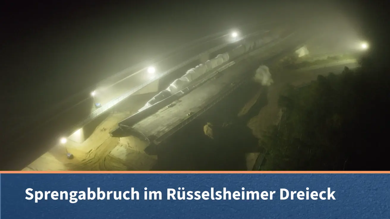 Zwei „alte“ Brückenbauwerke über der A67 am Rüsselsheimer Dreieck werden mittels Sprengung zum Einsturz gebracht. Die zwei nahezu baugleichen Brücken überspannen mit Ihren 140 Meter die A67. Die Ersatzneubauten sind fertiggestellt.