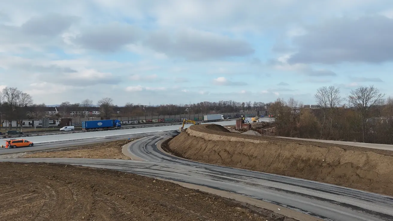 Die Aspahltarbeiten in der Anschlussstelle sind abgeschlossen. Der neue Lärmschutzwall ist errichtet und die alte/neue Lärmschutzwand entlang des Beschleunigungsstreifens wird noch aufgebaut. Anschließend folgen die Markierungsarbeiten auf der Strecke.