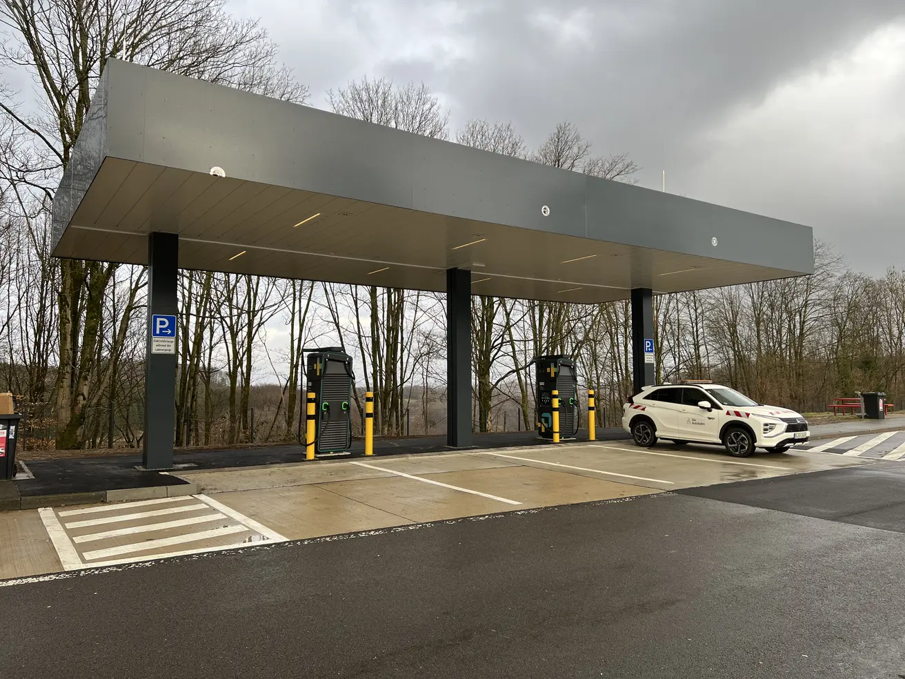 Auf dem Parkplatz können Elektrofahrzeuge nun schnellgeladen werden. Der Ladepark ist mit modernster Technik ausgestattet und bietet zwei Säulen mit je zwei CCS-Anschlüssen. Jeder Anschluss stellt bis zu 400 kW zur Verfügung. Rechnerisch reicht das, um einen Mittelklassewagen binnen 10 Minuten mit Strom für 300 bis 500 Kilometer (je nach Verbrauch) zu laden. Die Zukunftsfähigkeit des Ladeparks ist damit gesichert. Teilen sich zwei Fahrzeuge eine Säule, kann jedes von ihnen immer noch mit mindestens 200 kW geladen werden.